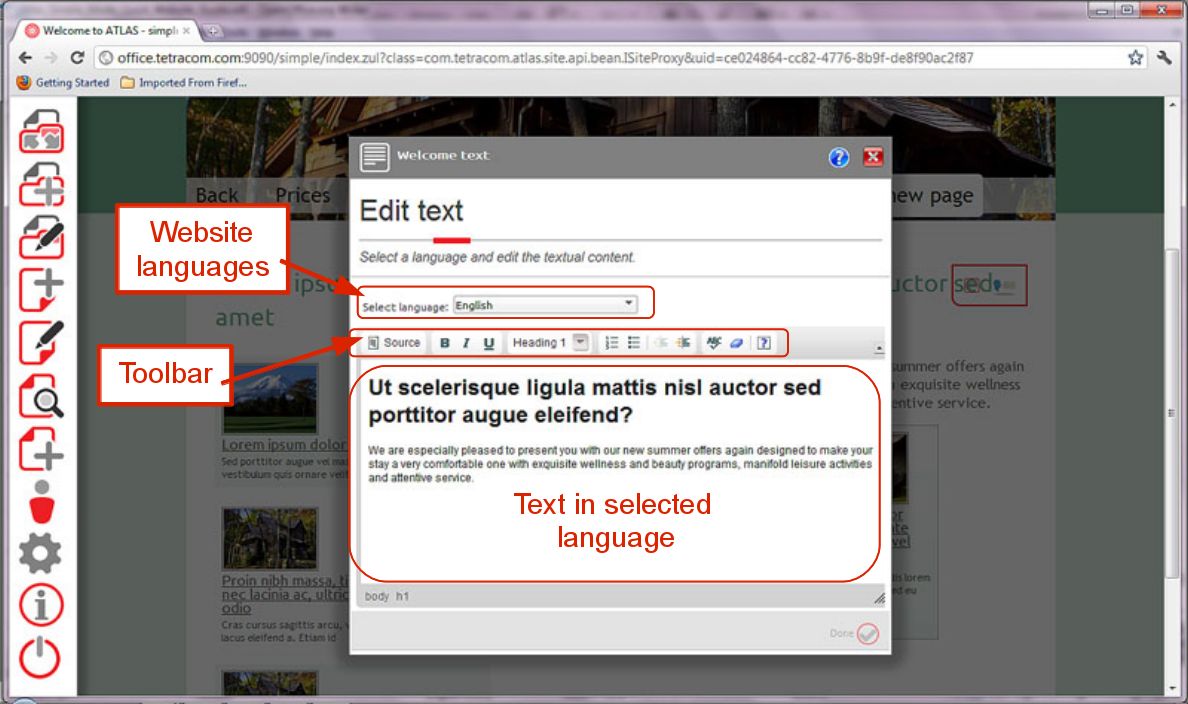 Each page component is edited directly from the page via the “Edit” shortcut (usually the leftmost shortcut) in its pop up menu as described in 3.2. a) Picture 9. You can browse through the pages in your website and edit them one by one if you like.