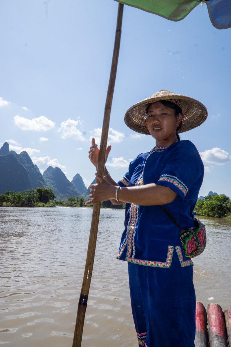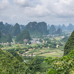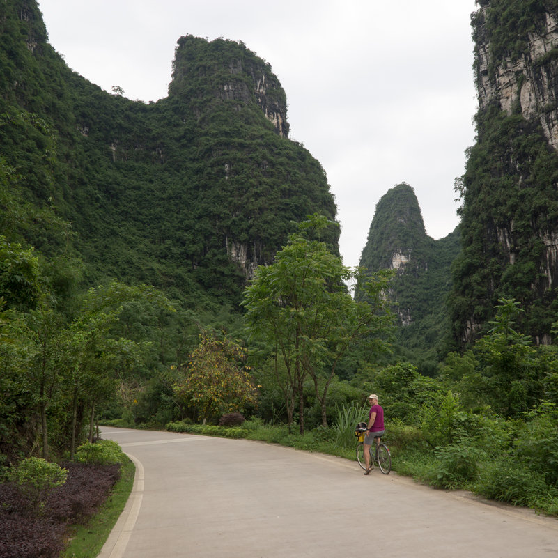 Местността около Янгсуо много прилича на заливът Halong във Виетнам, само дето го няма морето – високи карстови кули, обрасли с джунглярска растителност, малки пътчета, които изведнъж свършват в кафявата река, малки селца, от които хората ни гледаха пак с любопитство и усмивки. Стигнахме го емблематичния Moon Hill – хълм, с естествена почти идеално-кръгла огромна дупка в него. Изкачването не е трудно, само че беше доста горещо, така че си носете доста вода. Естествено имаше катерачи – маршрутите започват от категория 5б, та до 8а(+), според гидовника. Гледката е … не може да се опише с думи, те и снимките не мога да представят много точно тази красота, просто трябва да се види. На връщане спряхме да похапнем нещо на пътя (буквално) – не знаехме много както е – имаше тофу, люто и май лук, леко запържено – вкусно беше.